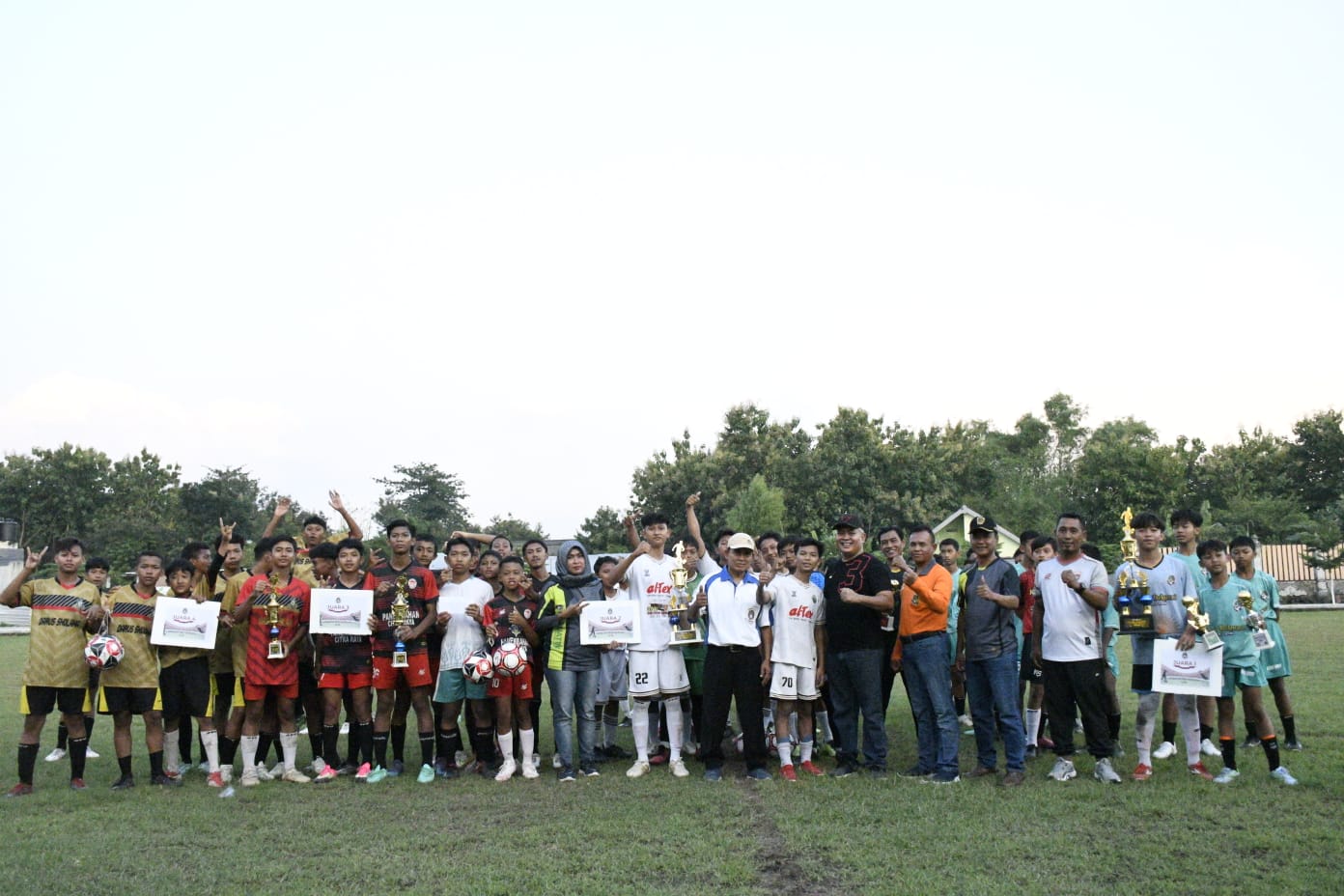 Selesai pertandingan Fery Sudarsono menyerahkan bantuan Bola Sepak kepada klub klub peserta Kompetisi Askab Pssi Madiun yang baru saja usai.