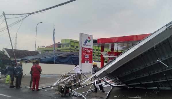 Mutono, salah seorang saksi mata di sekitar lokasi kejadian mengatakan, hujan bercampur angin kencang tersebut terjadi sekitar pukul 12.00 siang. Tiba-tiba atap dari bahan galvalum tempat pengisian bahan bakar tersebut diterbangkan angin dan terseret sampai bahu jalan.