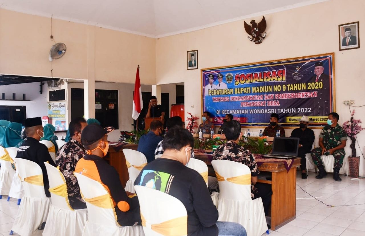 Kegiatan ini dihadiri juga oleh Kepala Desa, perwakilan BPD, perangkat desa , organisasi pencaksilat, tokoh pemuda dan ibu-ibu PKK se-Kecamatan Wonoasri. Adapun tujuan diselenggarakannya kegiatan sosialisasi ini adalah memberikan pengetahuan kepada aparat Pemerintahan Desa tentang Peraturan Bupati Madiun nomor 9 tahun 2020 dalam pengangkatan dan pemberhentian perangkat desa guna memberikan pelayanan terbaik bagi masyarakat dalam mewujudkan pemerataan pembangunan nasional.