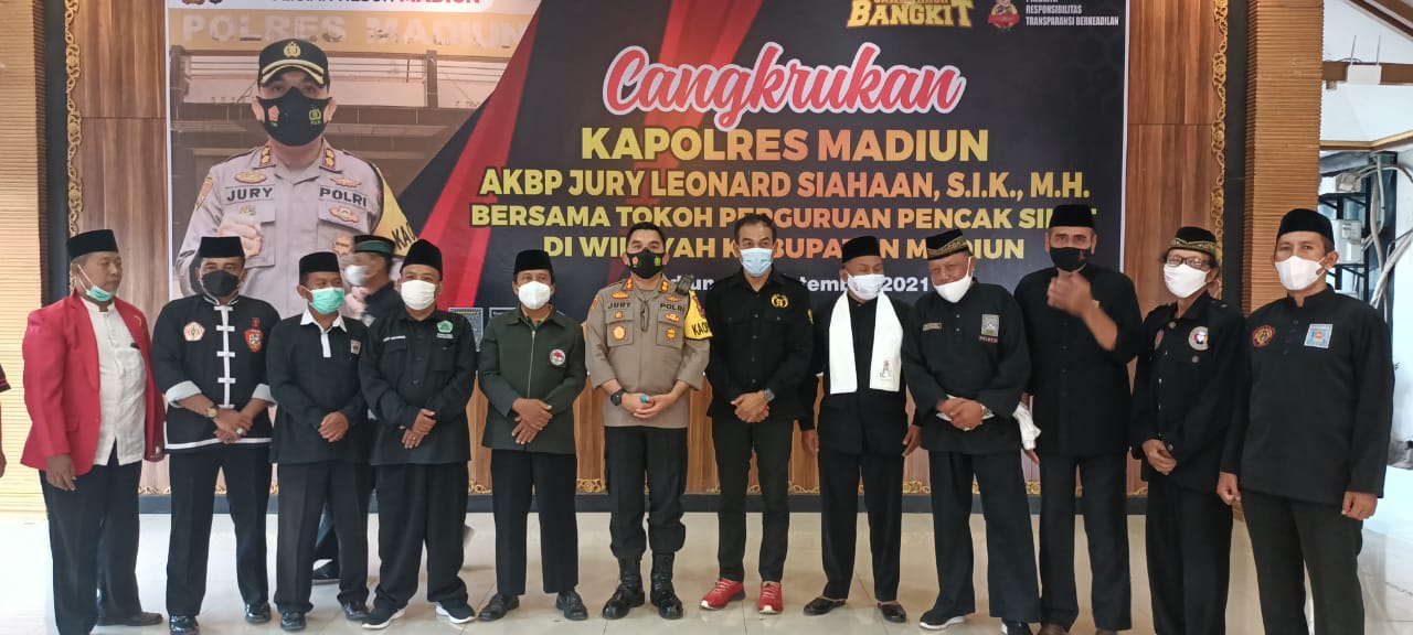 MADIUN,mataramanews.com – Sebanyak 14 cabang perguruan silat di Kabupaten Madiun berkumpul di Polres Madiun, Rabu (22/9/2021), atas undangan dari Kapolres Madiun, AKBP Jury Leonard Siahaan. Kapolres mengundang ke-14 perguruan silat itu untuk cangkrukan, untuk membangun kondisifitas daerah.